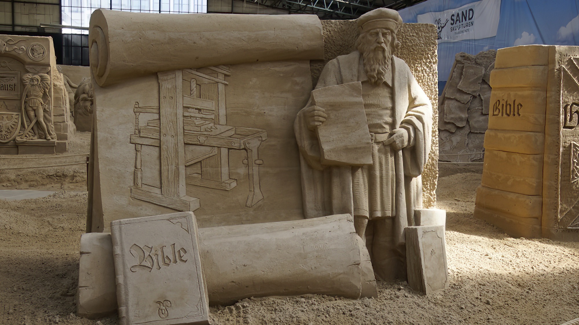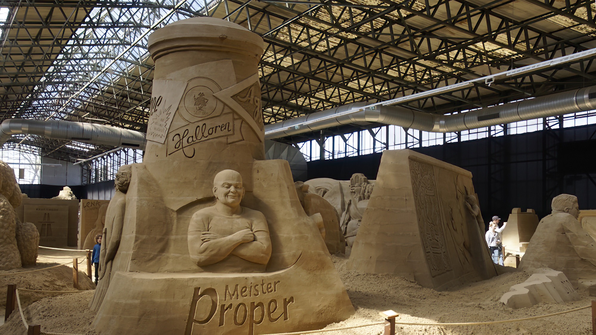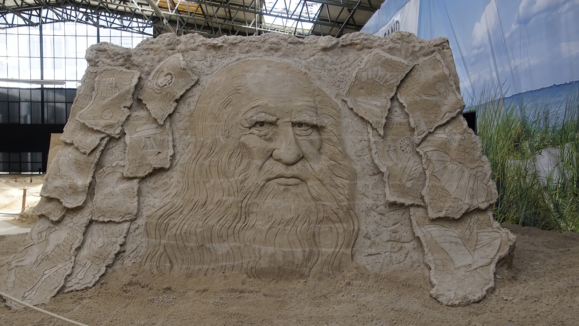 Die Sandskulpturen Ausstellung findet witterungsunabhängig in überdachten Bootshallen statt.