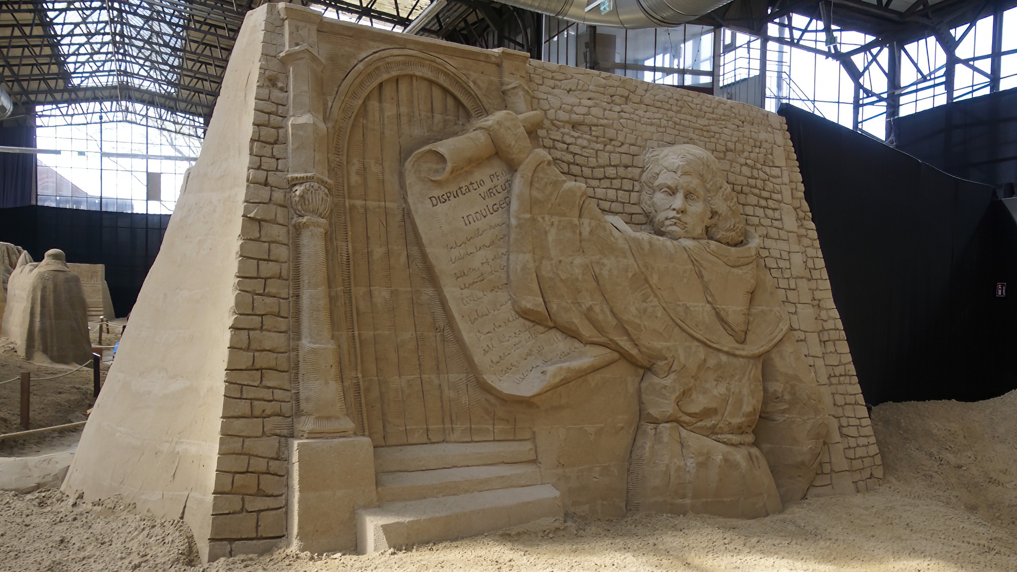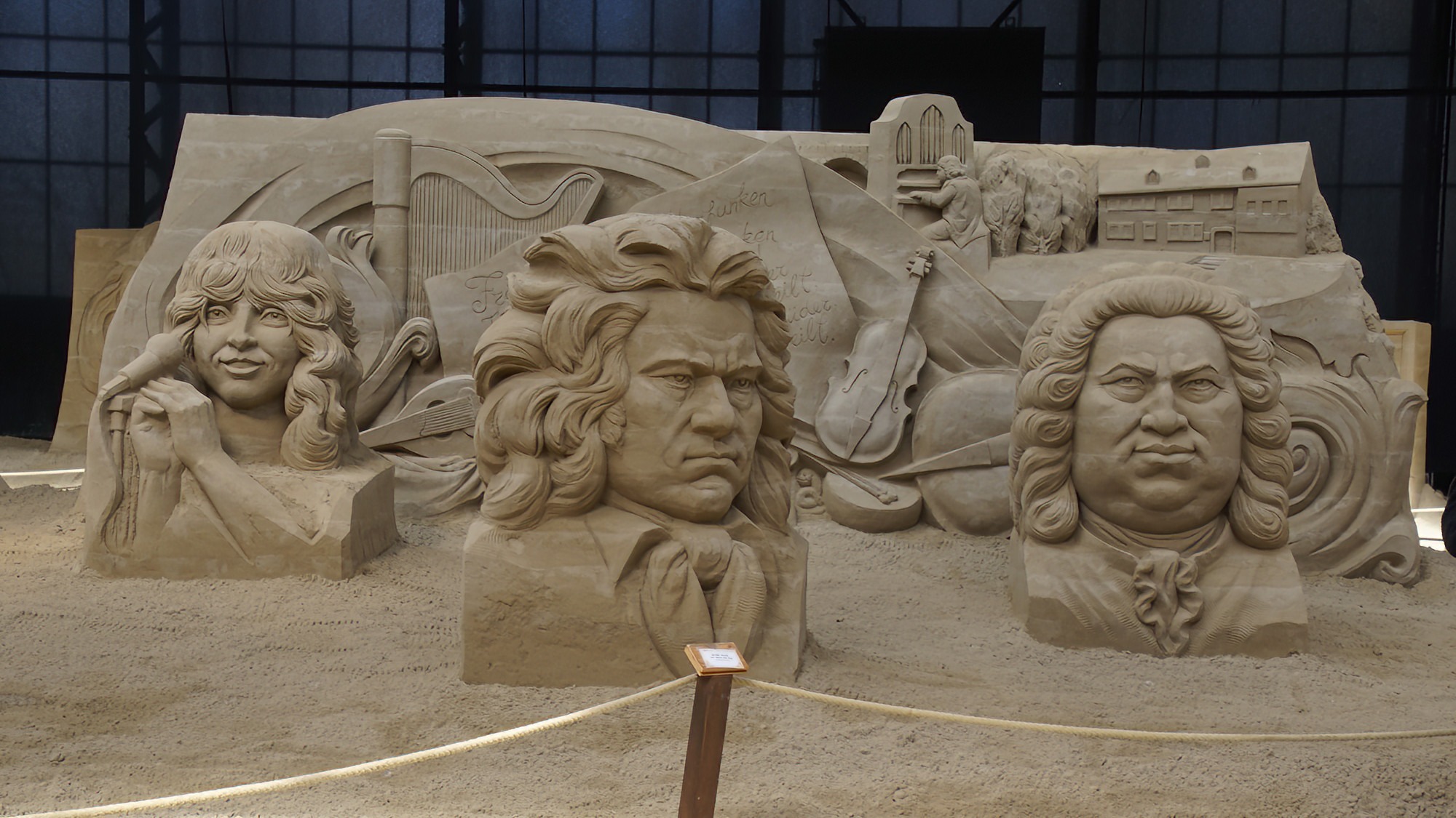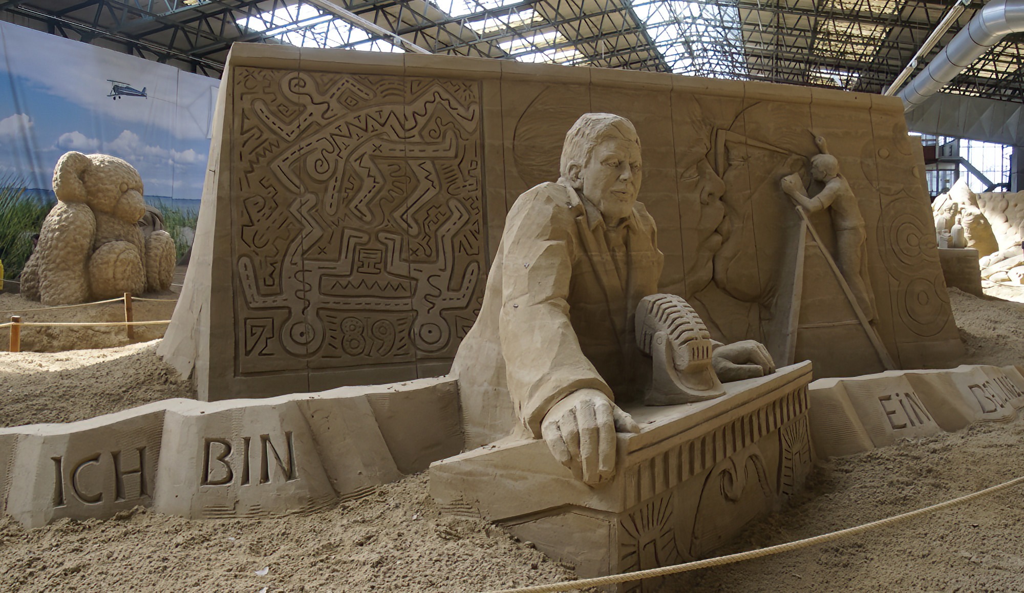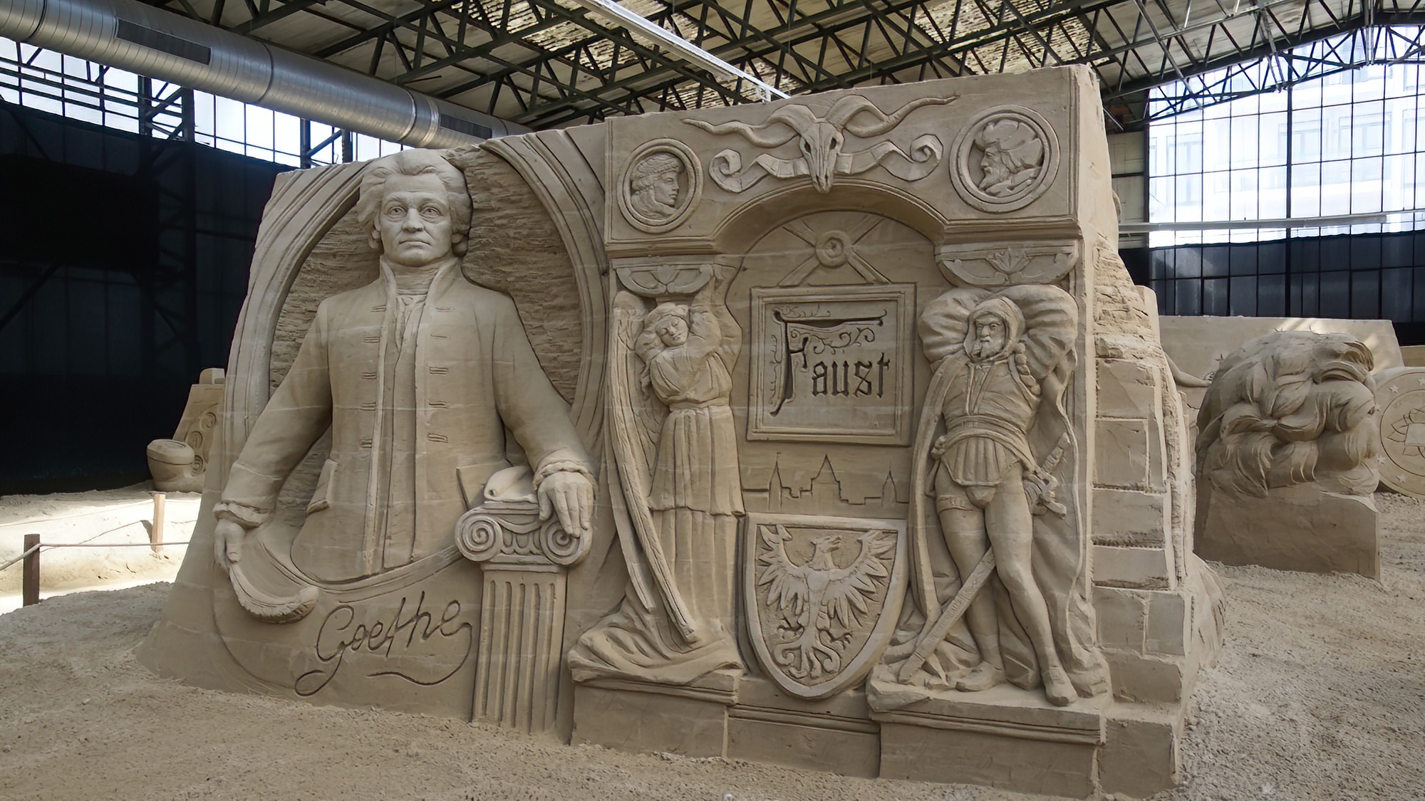 Die Sandskulpturen Ausstellung findet witterungsunabhängig in überdachten Bootshallen statt.
